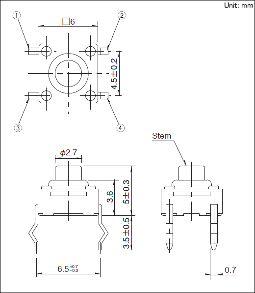 SKHWAQA010产品技术参数 1.类型:按入 2.动作力:2.55N 3.操作方向:Top push 4.行程:0.3mm 5.操作寿命(5mA 5V DC):500,000 cycles 6.初期接触电阻:100m max. 7.按钮颜色:Red 8.高度:h=5mm 9.最小订货单位(pcs.) :1,000 安装孔尺寸图: 电路图: