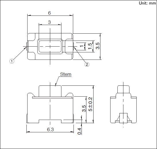 SKQMATE010产品技术参数 1.类型:Surface mount 2.动作力:0.98N 3.操作方向:Top push 4.行程:0.25mm 5.操作寿命(5mA 5V DC):50,000 cycles 6.初期接触电阻:500m max. 7.按钮颜色:Black 8.高度:h=5mm 9.最小订货单位(pcs.):2,000 外形图