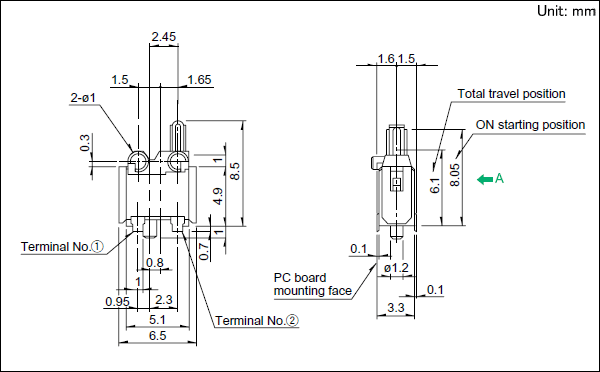 SPPB530701 产品技术参数 1.电路数:1 2.接点数:1 3.动作力:0.35N max. 4.无负载寿命:50,000 cycles 5.最小订货单位(pcs.):2,000