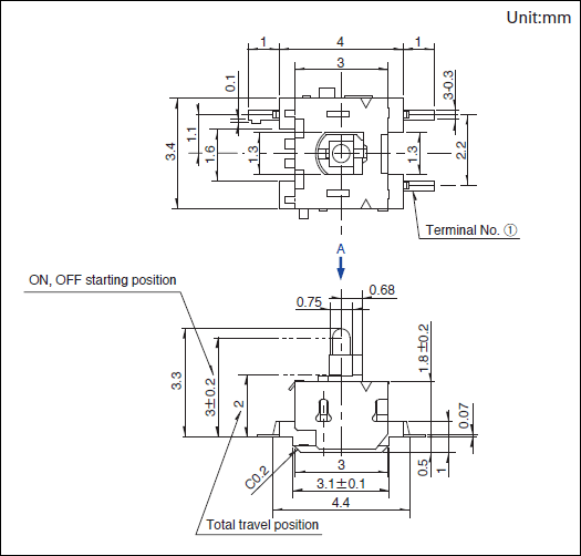 SPVE210100 产品描述 1.电路数: 1 2.接点数: 1 3.端子形状: For PC board (Reflow) 4.动作力: 0.3N max. 5.滑动杆高度(mm): 3.3 6.ON位置(mm): 3.0 7.全行程位置(mm): 2.0 8.负载寿命: 50,000 cycles 9.最小订货单位(pcs.): 2,800