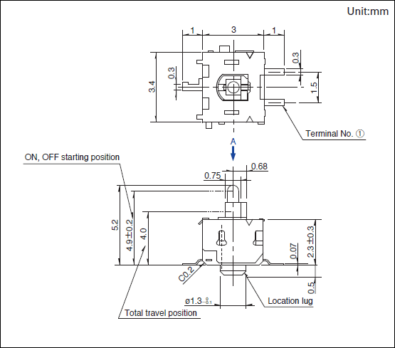 SPVE111300 产品描述 1.电路数: 1 2.接点数: 1 3.端子形状: For PC board (Reflow) 4.动作力: 0.3N max. 5.定位柱: 无 6.滑动杆高度(mm): 5.2 7.ON位置(mm): 4.9 8.全行程位置(mm): 4.0 9.负载寿命: 50,000 cycles 10.最小订货单位(pcs.): 2,000