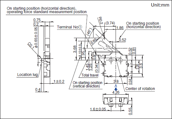 1.电路数:1 2.接点数:1 3.端子形状:For PC board (Reflow) 4.动作力:0.35N max. 5.扳手的长度:Long 6.操作方向:Left 7.定位销:有 8.最小订货单位(pcs.):5,000