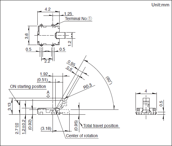 SPVR120102 产品技术参数 1.电路数:1 2.接点数:1 3.端子形状:For PC board (Reflow) 4.全行程位置(mm) 1.93 5.动作力:0.35N max. 6.寿命:50,000次 7.定位销:无 8.最小订货单位(pcs.):2,500