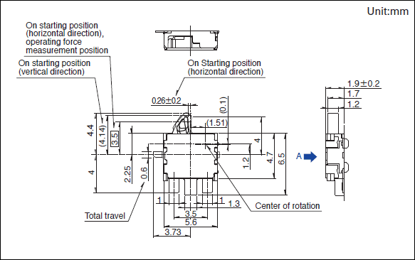SPVT220201 产品技术参数 1.电路数:1 2.接点数:1 3.端子形状:For PC board (Reflow) 4.动作力:0.4N max. 5.操作方向:Left 6.横端子:左有 7.定位柱:无 8.使用温度范围:-40℃ to +85℃ 9.无负载寿命:100,000 cycles 1 max. 10.最小订货单位(pcs.):2,500 外形图