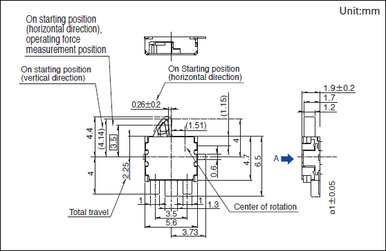 SPVT230201 产品技术参数 1.电路数:1 2.接点数:1 3.端子形状:For PC board (Reflow) 4.动作力:0.4N max. 5.操作方向:Left 6.横端子:右有 7.定位柱:无 8.使用温度范围:-40℃ to +85℃ 9.无负载寿命:100,000 cycles 1 max. 10.最小订货单位(pcs.):2,500 外形图