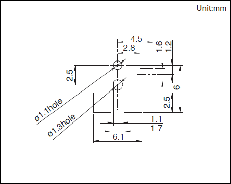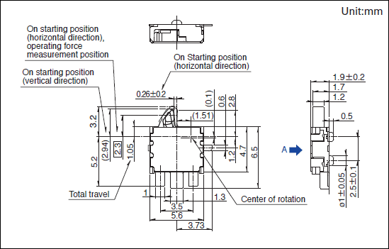 SPVT230101 产品技术参数 1.电路数:1 2.接点数:1 3.端子形状:For PC board (Reflow) 4.动作力:0.4N max. 5.操作方向:Left 6.横端子:右有 7.定位柱:有 8.使用温度范围:-40℃ to +85℃ 9.无负载寿命:100,000 cycles 1 max. 10.最小订货单位(pcs.):2,500 外形图