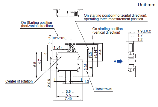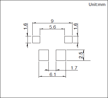 SPVT110201产品技术参数 1.电路数:1 2.接点数:1 3.端子形状:For PC board (Reflow) 4.动作力:0.4N max. 5.操作方向:Right 6.横端子:两侧有 7.定位柱:无 8.使用温度范围:-40℃ to +85℃ 9.无负载寿命:100,000 cycles 1 max. 10.最小订货单位(pcs.):2,500 外形图