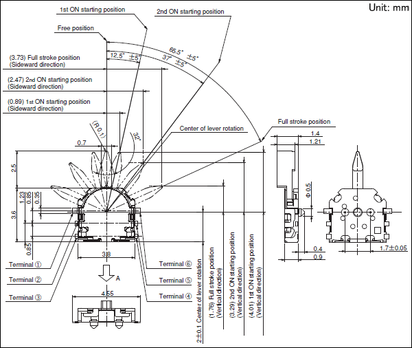 SSCQ110100 产品技术参数 1.电路数:1 2.接点数:左右方向各2接点 3.端子形状:For PC board (Reflow) 4.动作力:0.35N max. 5.定位柱:有 6.使用温度范围:-40℃ to +85℃ 7.无负载寿命:50,000 cycles 1Ω max. 8.最小订货单位(pcs.):4,000